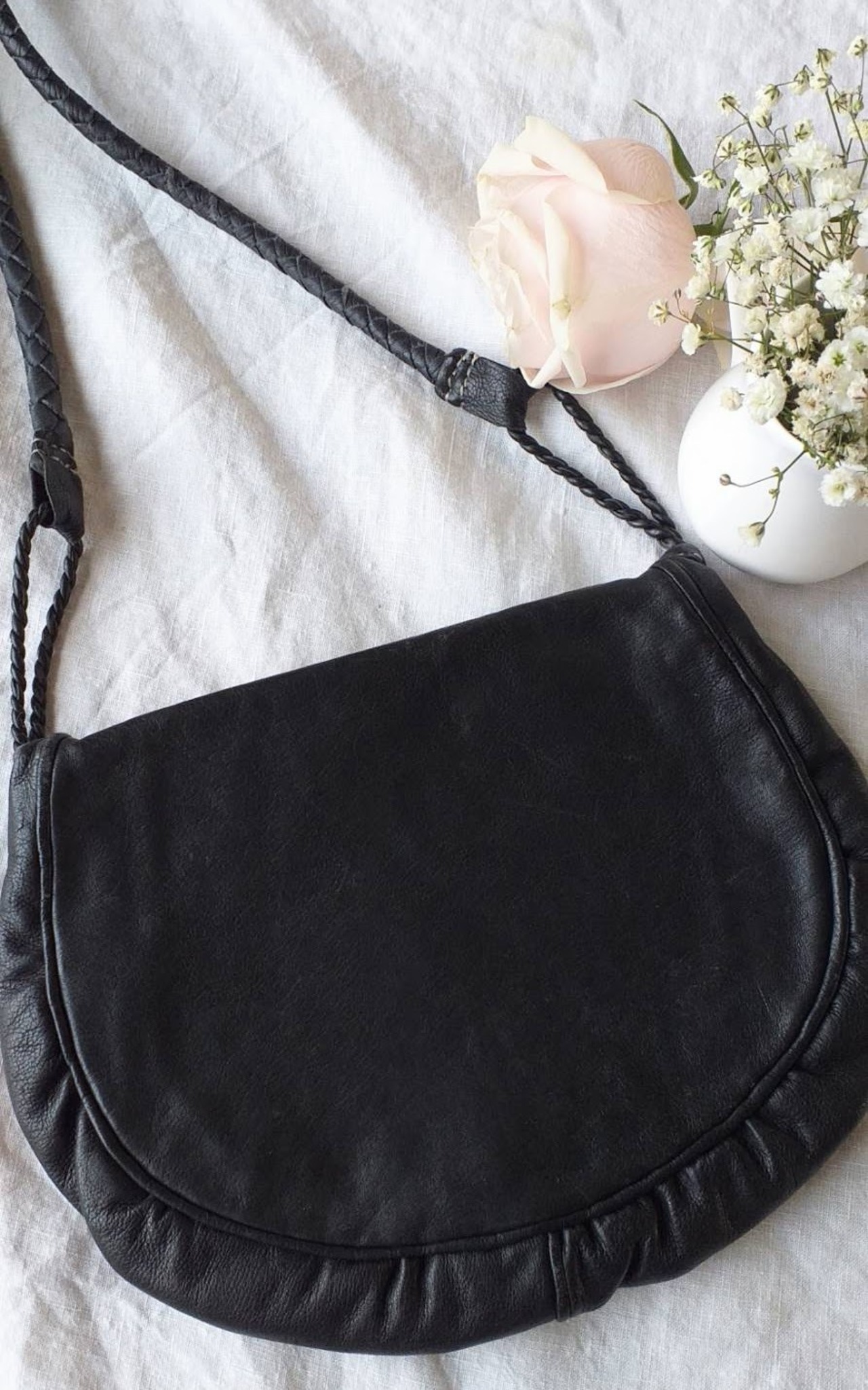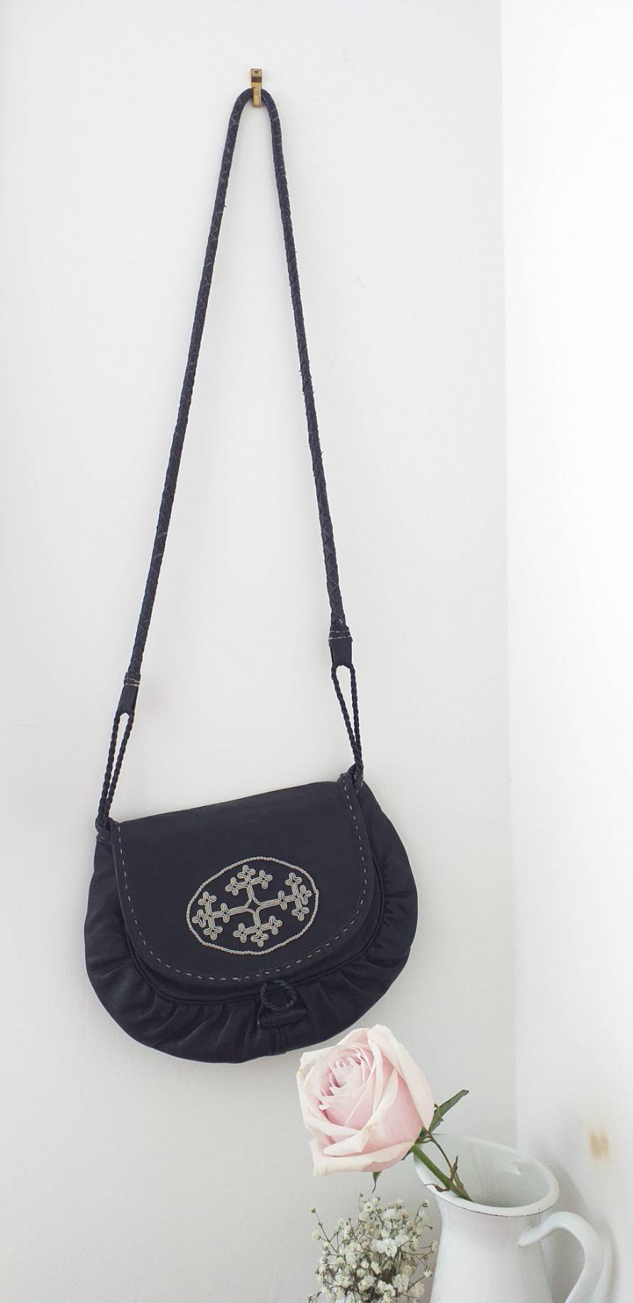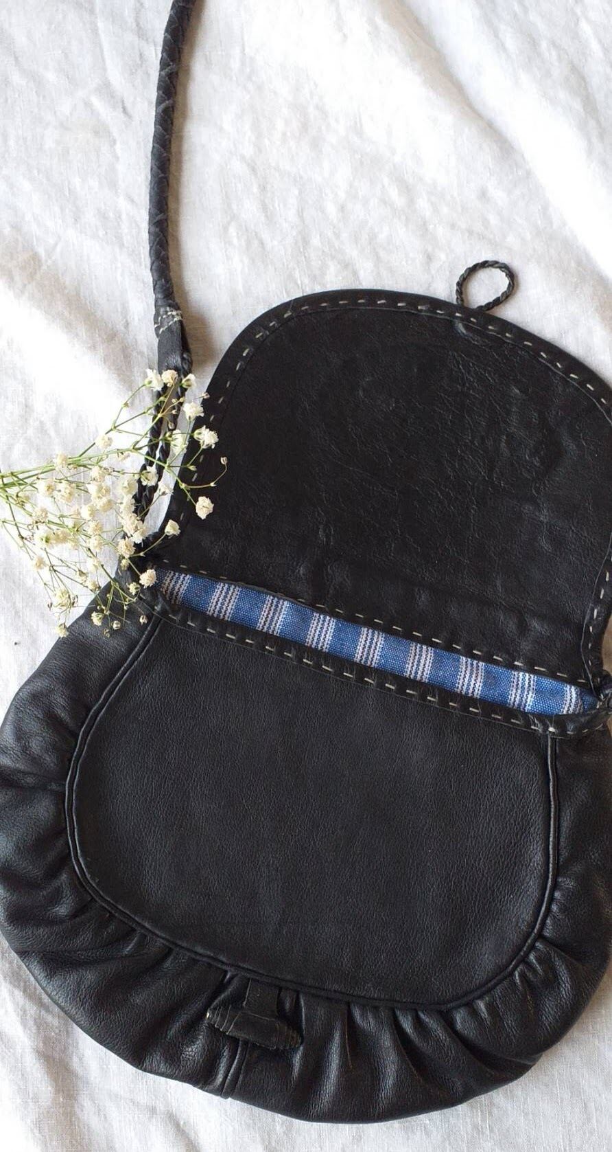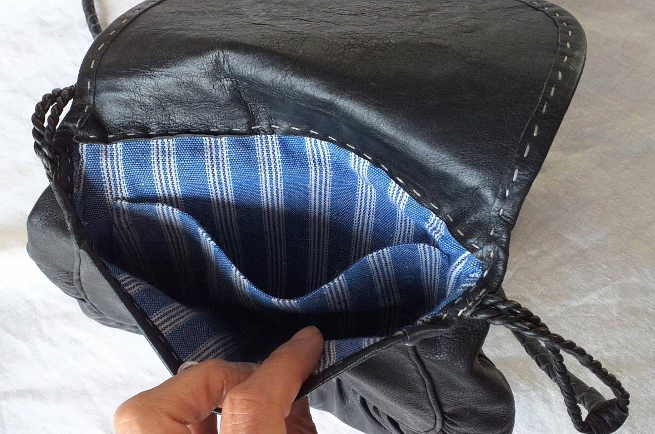 肩紐は細い革を編んで作られており